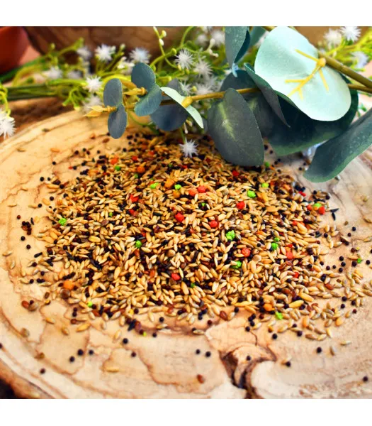 Composición: Alpiste, avena repelada, nabina, linaza, cañamón, negrillo, gránulo panificado/pienso compuesto.