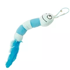Este gusano blandito y suave es perfecto para despertar el instinto depredador de nuestro gato gracias a sus plumas. Es de color azul con unas plumas del mismo color en un extremo, y un elástico en la cabeza para poder colgarlo en cualquier sitio y tentar así a su gato.