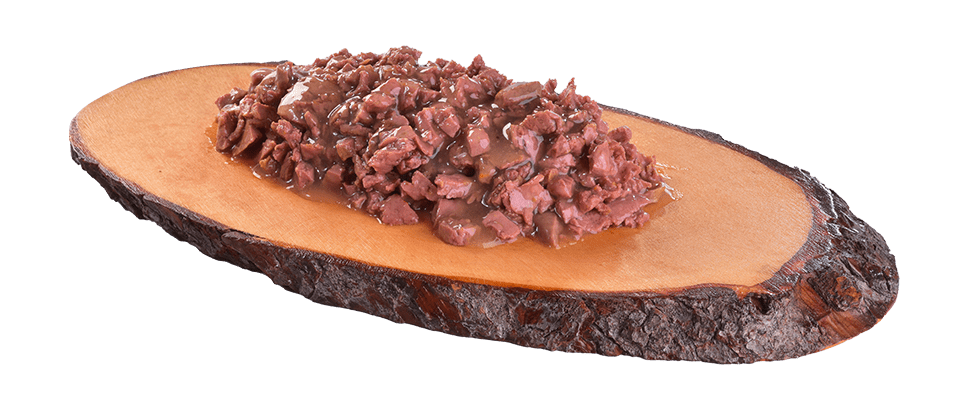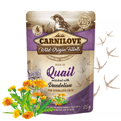85% carne en filetes (71% pollo, 14% codorniz), 12% caldo, 1% diente de león, 1% aceite de linaza, 0,5% minerales, 0,5% almidón vegetal