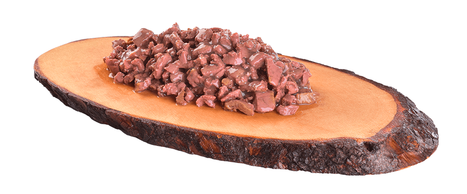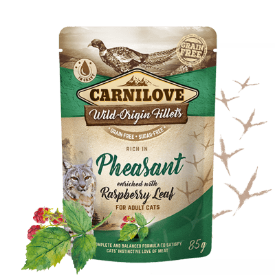 - INGREDIENTES: 85% de carne en filetes (71% de pollo, 14% de faisán), 12% de caldo, 1% de hojas de frambuesa, 1% de aceite de linaza, 0,5% de minerales, 0,5% de almidón vegetal.
