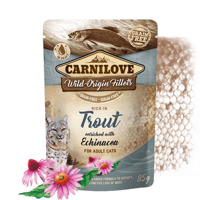 - INGREDIENTES: 85% de carne en filetes (71% de pollo, 14% de trucha), 12% de caldo, 1% de equinácea, 1% de aceite de linaza, 0,5% de minerales, 0,5% de almidón vegetal.