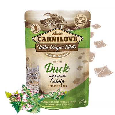La carne de pato hipoalergénica y altamente digerible es suave para el sistema digestivo y contribuye a una condición física óptima. El alto contenido de ácidos grasos poliinsaturados protege el corazón y el sistema circulatorio. La menta gatuna tiene propiedades antibacterianas, promueve la salud del tracto digestivo, reduce la aparición de enfermedades diarreicas y también tiene un efecto sedante, calma el sistema nervioso y protege contra el estrés. También protege contra los ectoparásitos y es un fuerte atrayente para los gatos que mejora el sabor.
