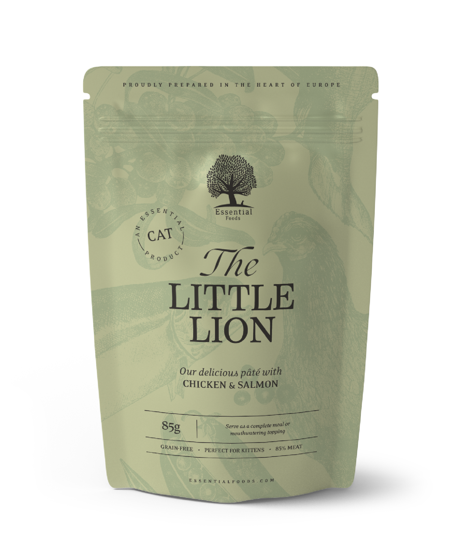 Filetes de pollo (65%), hígado (15%), salmón (5%), harina de guisantes (3%), fibras