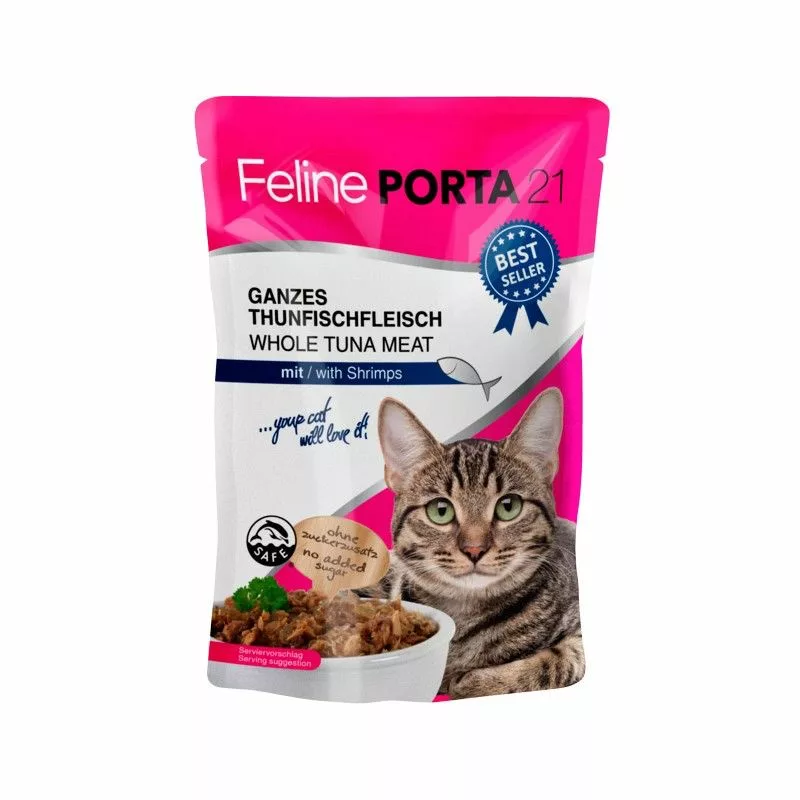 La comida húmeda Porta 21 es un ALIMENTO COMPLEMENTARIO para gatos de cualquier tamaño y edad. Elaborados con ingredientes de la mejor calidad apto para el consumo humano. ¡Sin cereales!