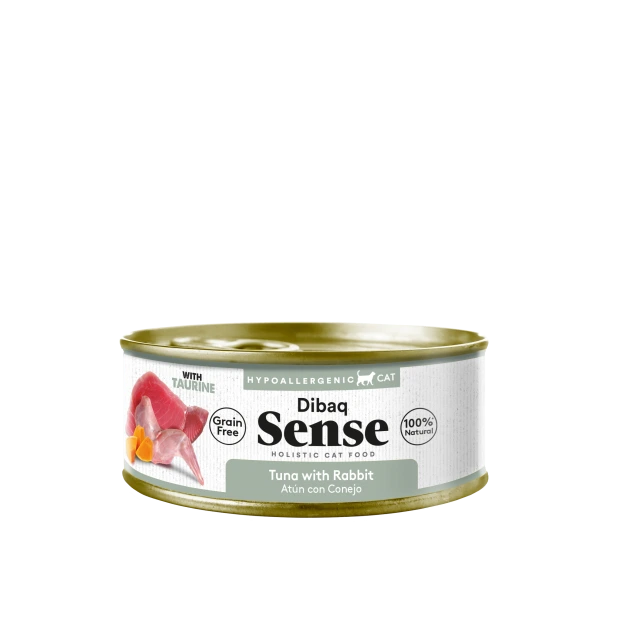 Dibaq Sense Cat Atún con Conejo es una latita sin cereales de 70g para gatos adultos de todas las razas. Elaborada con carnes frescas de atún y conejo, calabaza, prebióticos y extracto de yuca.