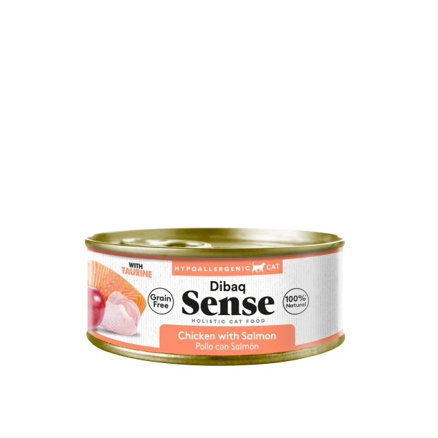 Dibaq Sense Cat Latita de Pollo con Salmón es una receta hipoalergénica para gatos adultos de toda las razas elaborada con ingredientes 100% naturales. Carnes frescas de pollo, salmón, manzana. Prebióticos y extracto de yuca. Textura Fillets.