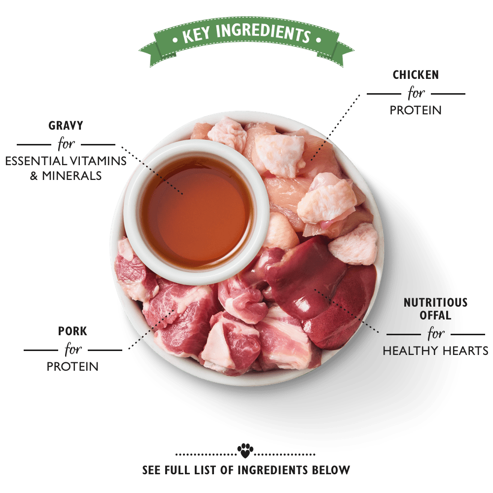 - 2 x Sabrosos menús de Pollo en Salsa (85g): 53% Recién Preparado: Pollo 40%, Cerdo 13%, Gravy, Minerales.