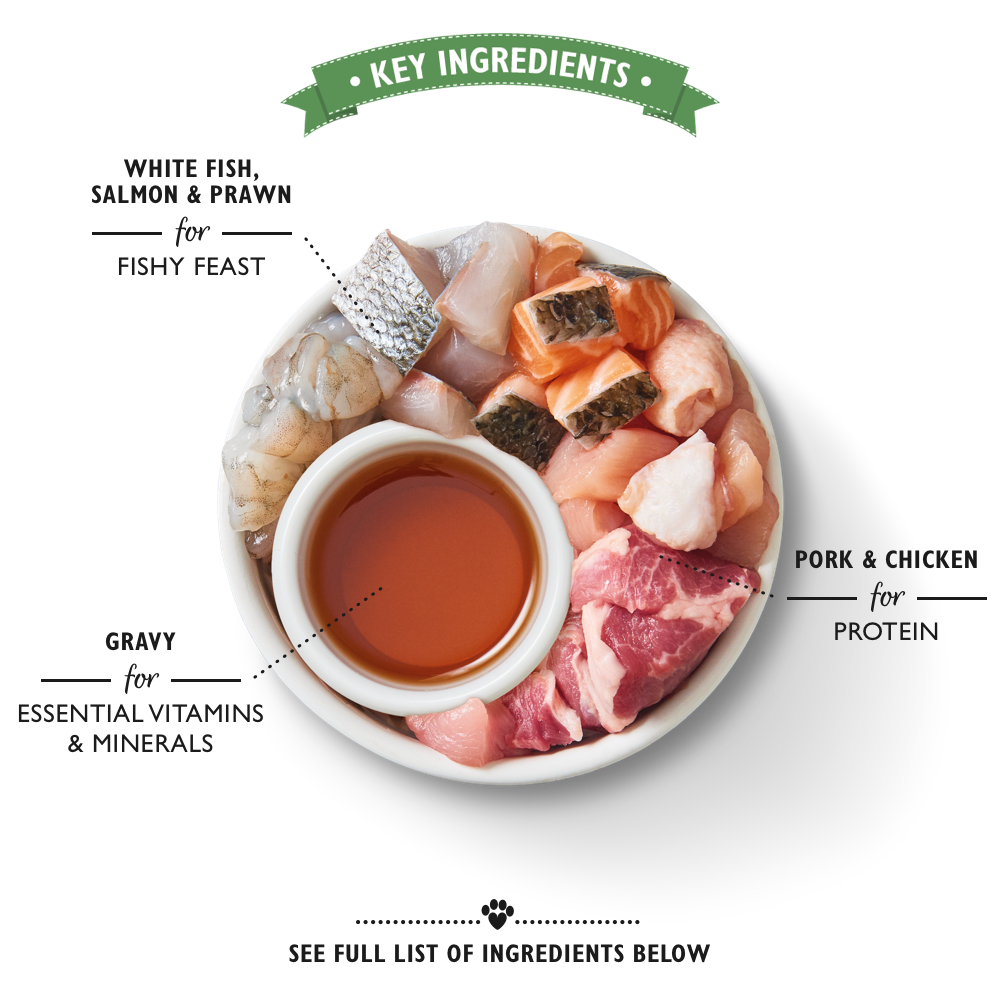 - 2 x Sabrosos menús de Pescado del océano (85g): 53% Recién Preparado: Pescado 26% (Pescado Blanco 11%, Salmón 10%, Langostino 5%), Cerdo 14%, Pollo 13%, Gravy, Minerales.