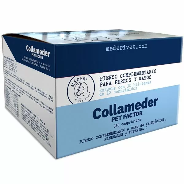 COLLAMEDER PET FACTOR va dirigido a mejorar el funcionamiento de todos los órganos donde el colágeno es fundamental para reparar el tejido, prevenir la enfermedad y mejorar el estado de salud de las mascotas. Está especialmente indicado para mascotas con alto nivel de ejercicio, problemas de sobrepeso, después de alguna lesión articular, razas de crecimiento rápido o animales de edad avanzada. Contribuye a mejorar los síntomas del proceso de envejecimiento natural y al correcto funcionamiento de los vasos sanguíneos, huesos, cartílagos, encías, piel y dientes. Además, COLLAMEDER PET FACTOR incluye en su fórmula magnesio, el cual contribuye al funcionamiento normal de los músculos y del sistema nervioso, así como al mantenimiento de los huesos y dientes en condiciones normales. Por todo ello, COLLAMEDER PET FACTOR proporciona protección frente al deterioro articular (artrosis y artritis), mejora la salud cardiovascular, periodontal y proporciona brillo y elasticidad a la piel y pelaje de nuestras mascotas. COLLAMEDER PET FACTOR puede ayudar también a sanar las heridas, ya que el colágeno promueve la curación y acelera la cicatrización después de una intervención de cirugía.