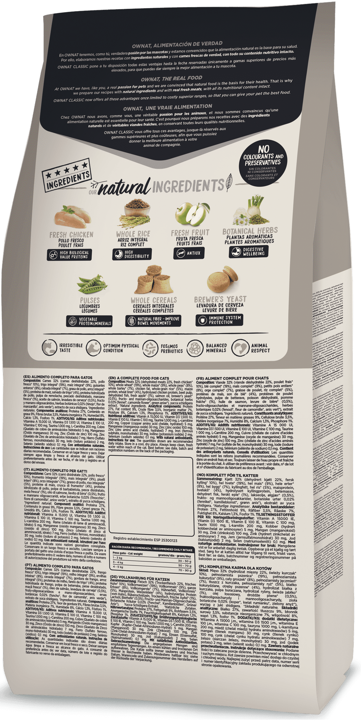 Las cantidades que se indican son raciones diarias recomendadas. Conservar en un lugar fresco y seco. Dejar siempre agua limpia y fresca al alcance del gato. Caducidad: 18 meses.