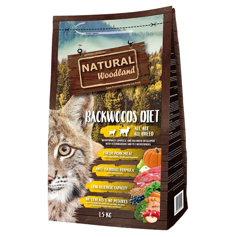 Carne deshidratada de cerdo 36%, Carne fresca de cerdo 15%, Tapioca, Guisantes, Grasa de cerdo 8,5%, Pulpa de manzana, Aceite de Salmón 2%, Minerales, Hidrolizado de hígado de cerdo 1,75%, Hidrolizado de vegetales, Proteína de guisantes, Levadura de cerveza, Algarroba, Frutas (pera, manzana y arándanos) 3.000 mg/kg, Verduras (calabaza, zanahorias, espinacas, brócoli y jengibre) 3.000 mg/kg, Romero, Extracto de malta 500 mg/kg.