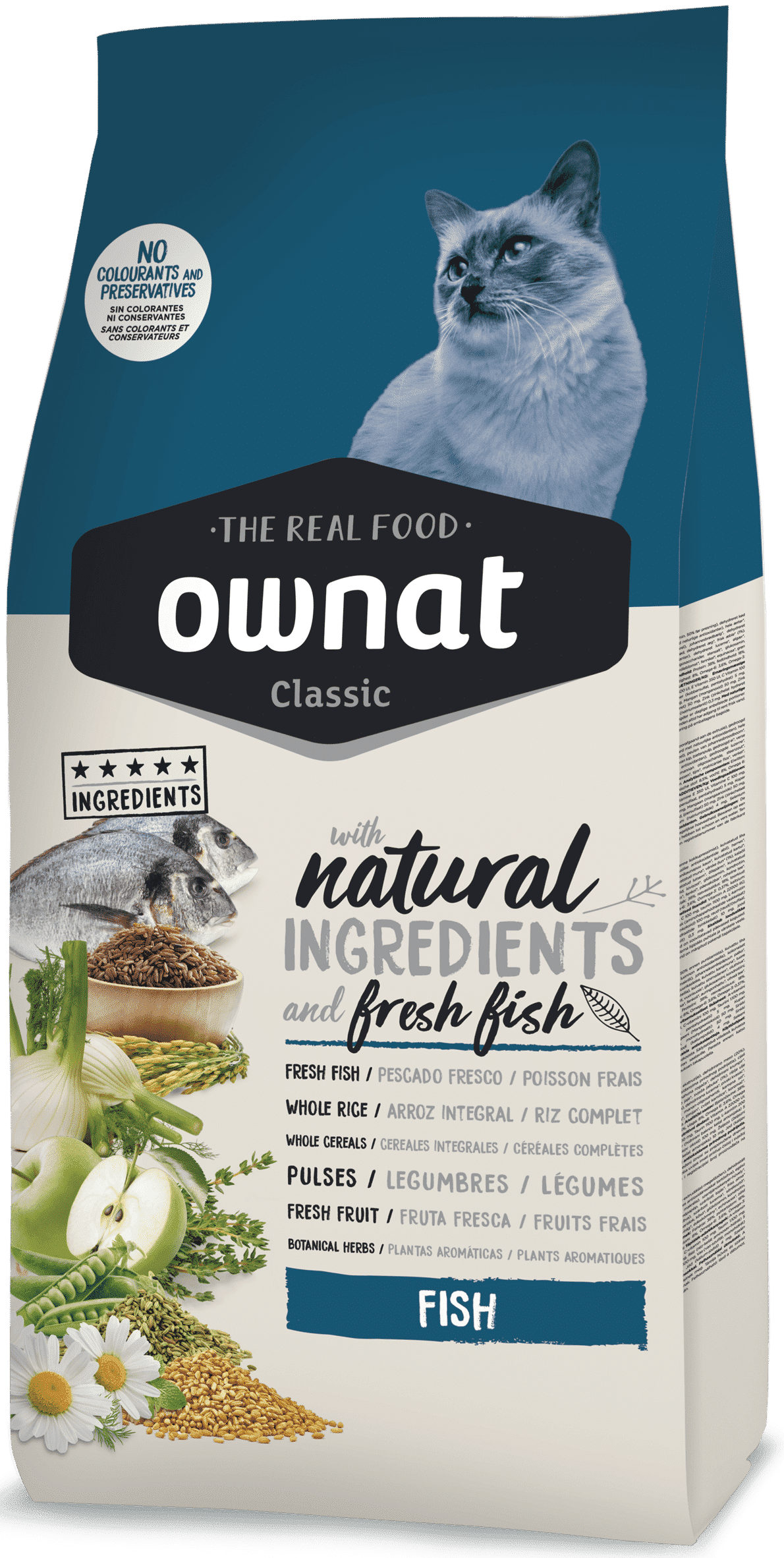 Carnes deshidratadas 22%, pescado 15% (pescado fresco* 10%, pescado deshidratado 5%), trigo integral* (15%), grasa de pollo, cebada integral* (9%), maíz integral* (9%), arroz integral* (6%), guisantes enteros* (3%), proteína de maíz, levadura de cerveza* (2%), proteína hidrolizada de pollo, manzana fresca* (1%), aceite de salmón, pulpa de remolacha, fructo y manano oligosacáridos, hierbas botánicas 0,02% (hinojo*, flor de manzanilla*, anís verde*), yucca schidigera. *Ingredientes naturales.