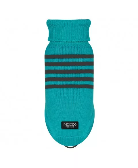 Jersey Técnico Azul Agua Marina con rayas grises, elaborado con un punto fino muy elegante. Dispone de un velcro en un lateral, detrás de una de las patas delanteras para que sea más fácil quitar y poner.