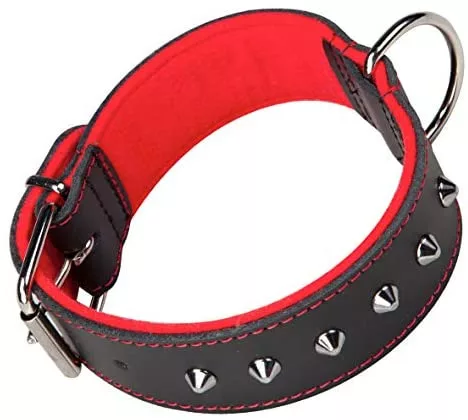 Collar de cuero negro con tachuelas en forma de mini pinchitos. Tiene un interior de fieltro para hacerlo más acolchadadito y cómodo. Todos los tamaños tienen un ancho de 4 cm.