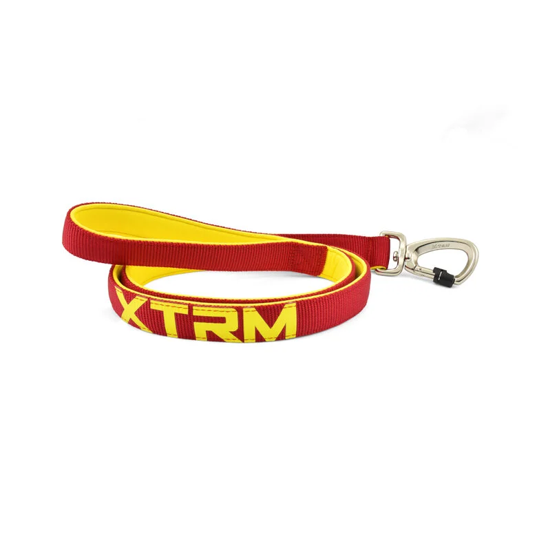 La correa X-TRM Neon Flash es de nylon de alta calidad,con la parte reversible acolchada de neopreno,que a parte de ser muy suave y cómoda evita rozaduras en el agarre,tiene impresas letras reflectantes y mosquetón de seguridad cromado,súper ligero y fácil de enganchar..