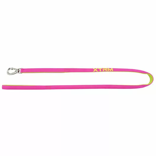 La correa X-TRM Neon Flash es de nylon de alta calidad,con la parte reversible acolchada de neopreno,que a parte de ser muy suave y cómoda evita rozaduras en el agarre,tiene impresas letras reflectantes y mosquetón de seguridad cromado,súper ligero y fácil de enganchar..