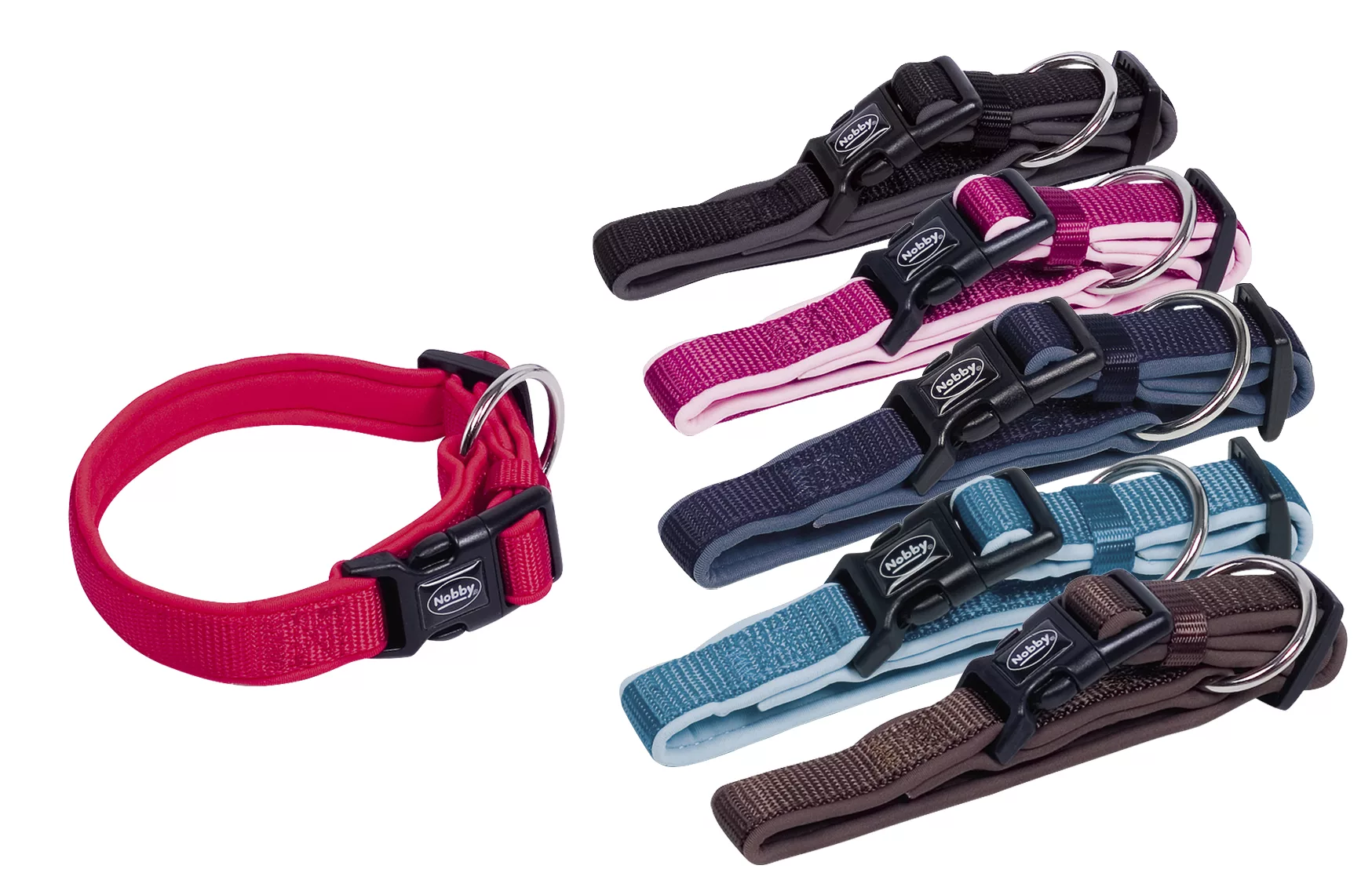 Collares de nylon con neopreno Nobby, muy resistentes y seguros. Con acolchado de neopreno para que sea más suave y no se clave en el cuello.