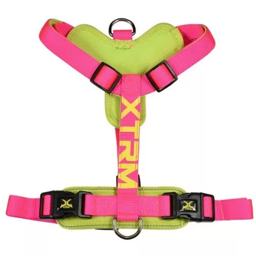 Los arneses de la línea X-TRM Cronos Neon Flash llaman la atención a simple vista por su diseño moderno y colorido. Combinan colores fosforitos muy llamativos como el naranja, el amarillo, el fucsia o el verde. Son completamente ajustables, tanto en el cuello como en el pecho, para adaptarse a la perfección al cuerpo de cada perro. Sus correas son fuertes y suaves al tacto, con anillas de acero inoxidable y cierres de plástico robustos para un agarre seguro. Debajo de las correas incorporan refuerzos blanditos de neopreno para que el animal se sienta mucho más cómodo.