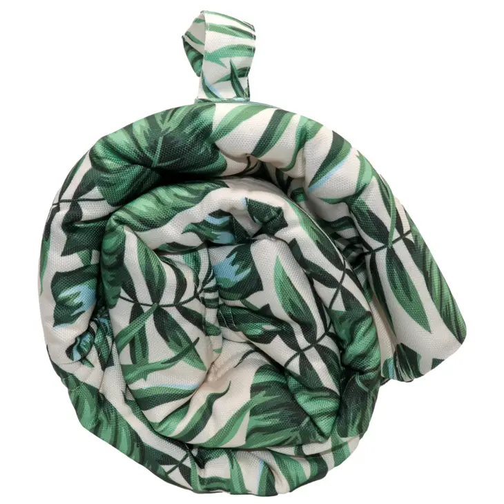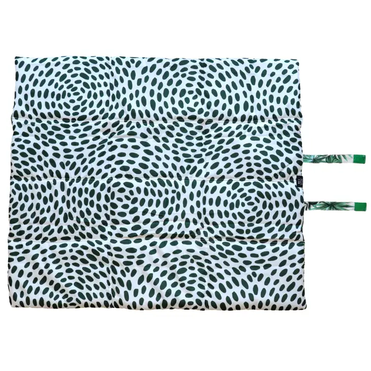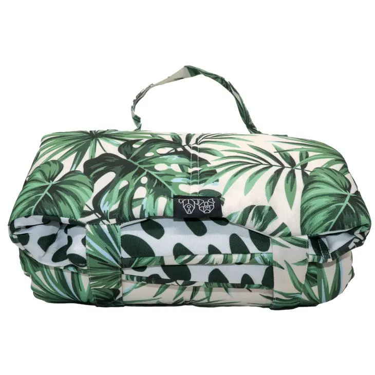 Esta cama enrollable es ideal para cuando nos vamos de viaje y no queremos cargar con muchos trastos, se puede llevar a todas partes, es acolchada y lleva un asa que facilita su transporte. Se puede lavar a máquina. Tiene un precioso estampado de monstera por un lado y reversible por el otro con manchitas. Es perfecta para llevar en el coche y que no manchemos de pelitos los asientos.