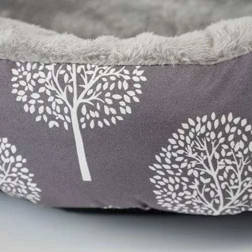 Está fabricada con un tejido tipo terciopelo extra-suave. El interior es todo gris, y el exterior tiene un romántico estampado de árboles blancos.