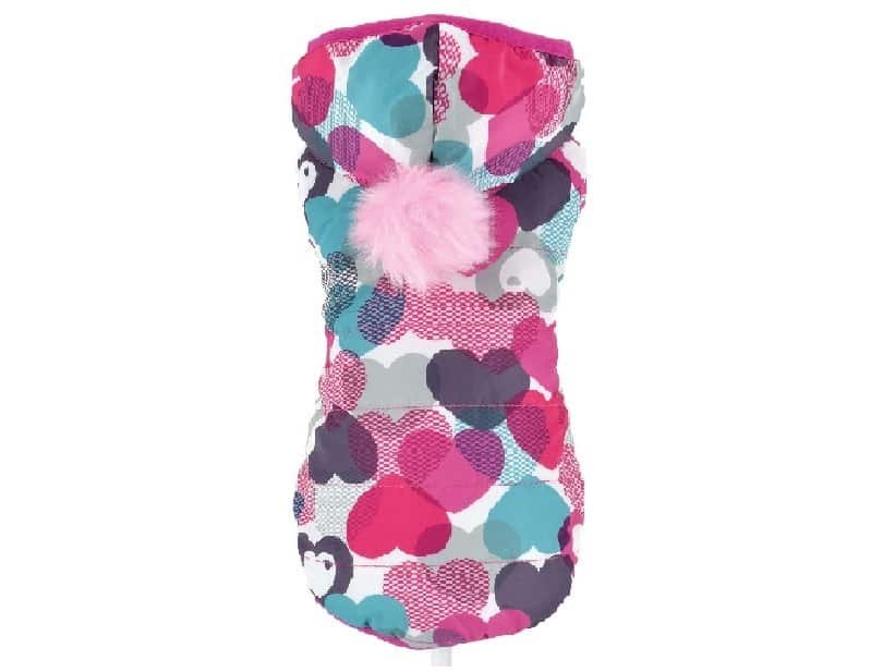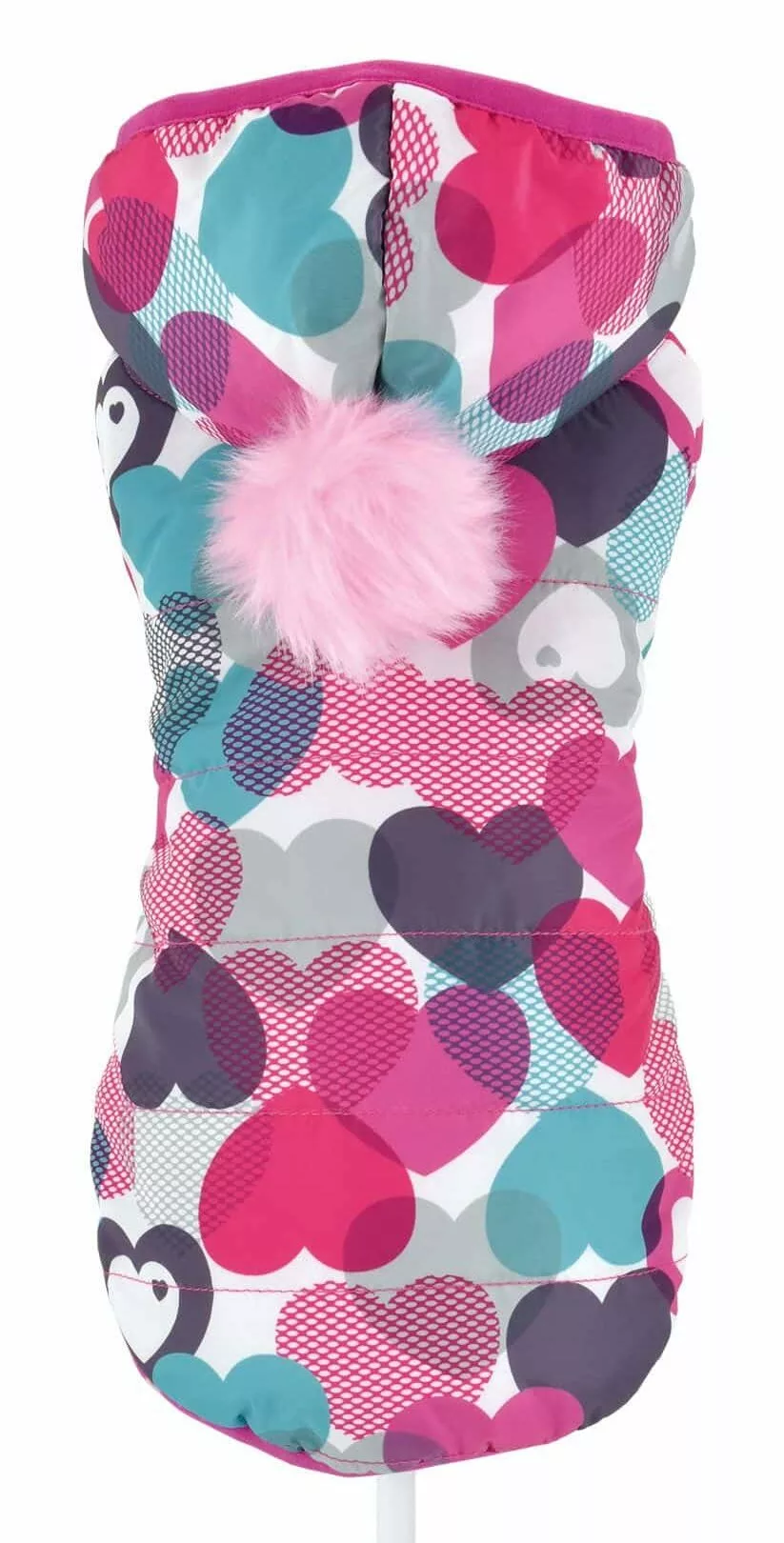 Chaqueta con estampado de corazones. Interior de forro polar rosa muy calentito, gorro que se fija con corchete terminado en pompón rosa. Ajustable con tres velcros en la parte interior. Tiene ojal para sacar el enganche del arnés y goma para ajustar al rabo.