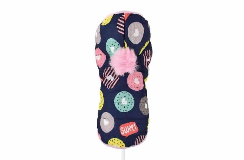 Chaqueta con estampado de rosquillas de colores. Interior de forro polar rosa muy calentito, gorro que se fija con corchete terminado en pompón rosa. Ajustable con tres velcros en la parte interior. Tiene ojal para sacar el enganche del arnés y goma para ajustar al rabo.