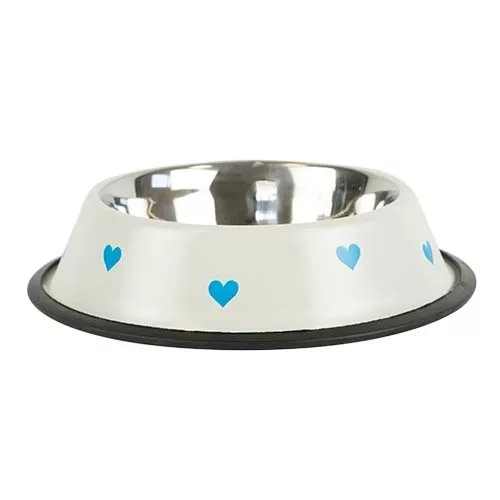 Comedero de acero inoxidable con base antideslizante y diseño de corazones azules.