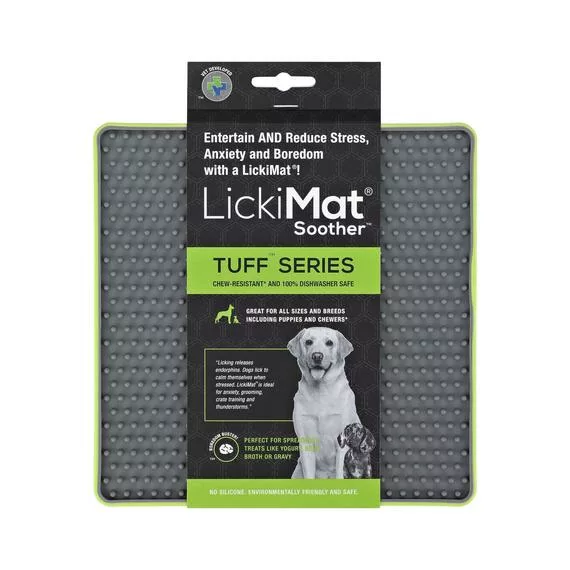 LickiMat shooter tuff, es una esterilla de látex con una textura de puntitos en relieve que te permite untar comida para que tu mascota la vaya sacando con cada lametón. La versión Tuff esta diseñada con una carcasa exterior más dura que la clásica playdate, en consecuencia la textura es más rígida para nuestros perros