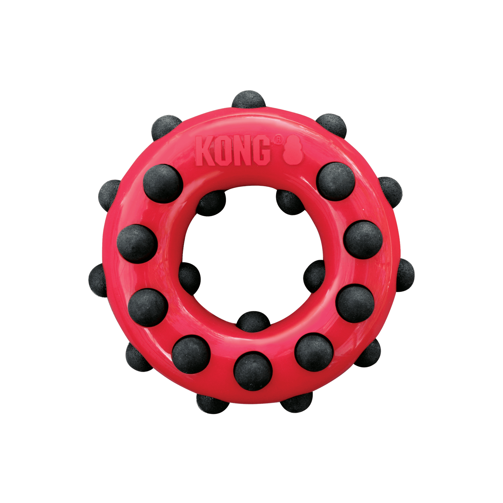 Mordedor con forma de rosquilla, con bolitas que sobresalen, ideal para masajear las encías. Cuando se lanza rebota en varias direcciones lo que lo hace más atractivo para el juego, se puede rodar, lanzar y jugar al tira y afloja con e