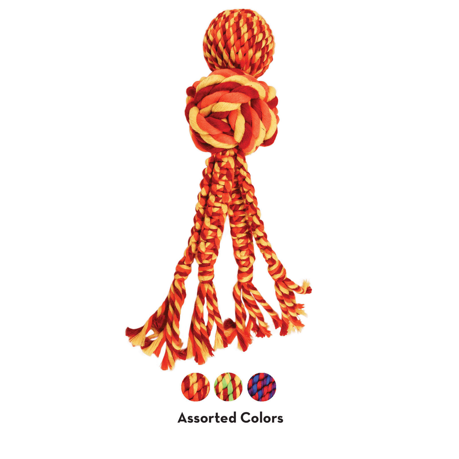Este juguete combina la emoción de recoger y tirar con una experiencia de masticación duradera. La cuerda retorcida anudada se entrelaza para ofrecer una experiencia duradera para los instintos de masticación naturales y, a la vez, ayuda a limpiar dientes y encías. Las colas largas, también fabricadas con cuerda entretejida, son ideales para la diversión natural de destrozar. Para despertar más interés, posee un chirriador que invita a sesiones de juego más duraderas. Ideal para jugar en interiores o al aire libre.