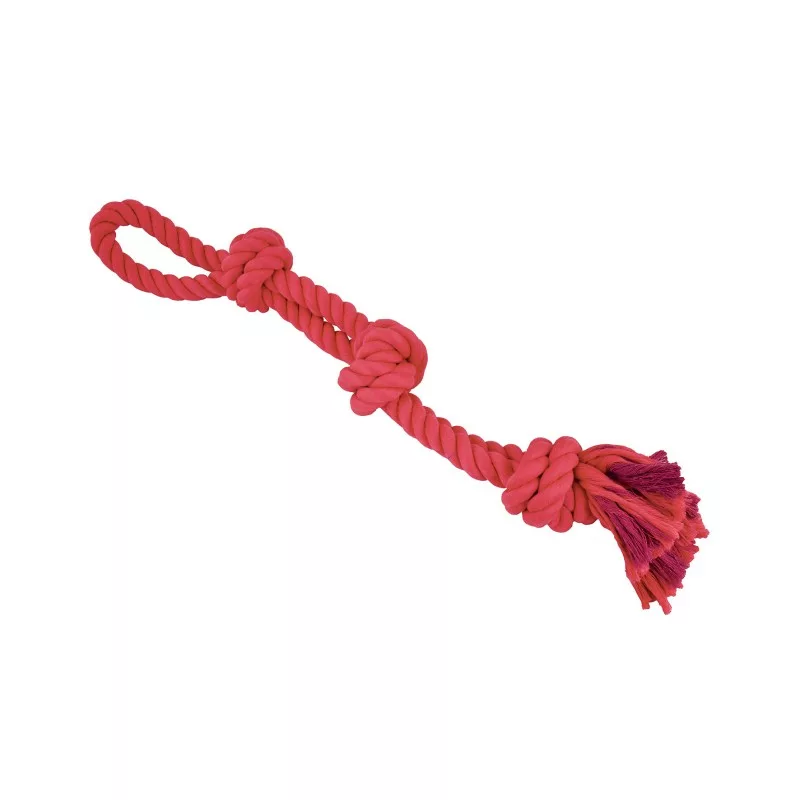 Cuerda súper resistente con tres nudos y 60 cm de longitud.Fortalece la mandíbula y contribuye a la higiene dental de su mascota. Juguete ideal para juegos de lanzar, traer, tirar y aflojar. Ideal para todas las edades y especialmente pensado para perros que necesitan juguetes más grandes y resistentes.