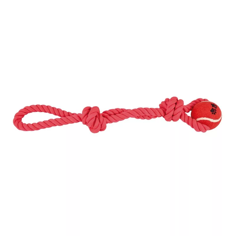 Cuerda para perros con nudos y una divertida pelota de tenis. Dispone de una práctica asa para jugar de forma interactiva con tu mascota, arrastrando la pelota por el suelo. Ideal para jugar al aire libre.