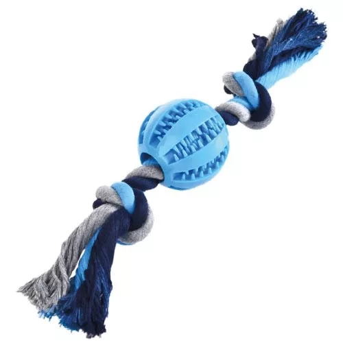 Divertido juguete interactivo para perros con pelota de goma y nudo de algodón.