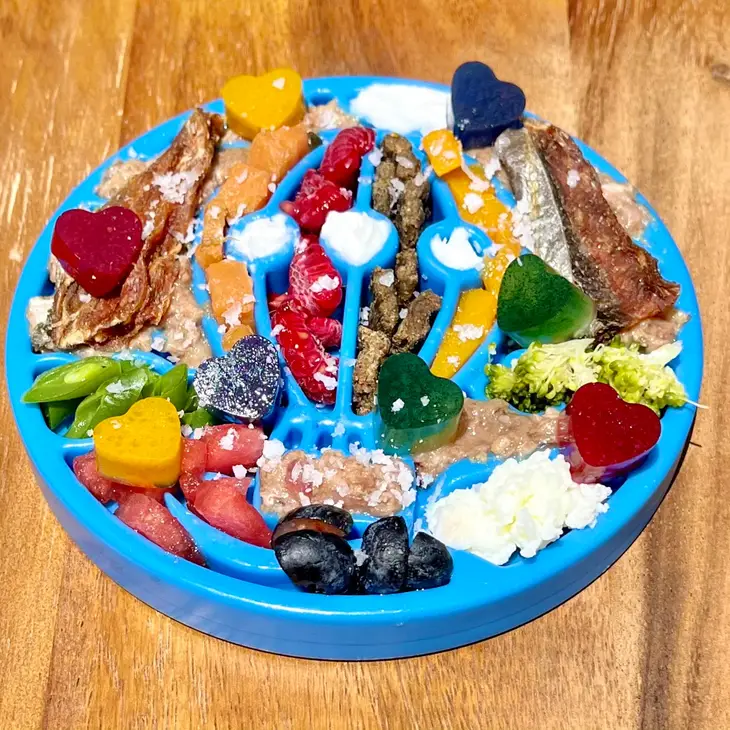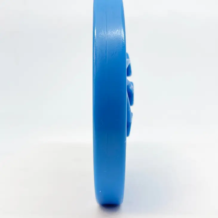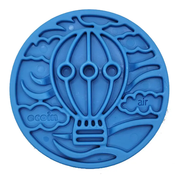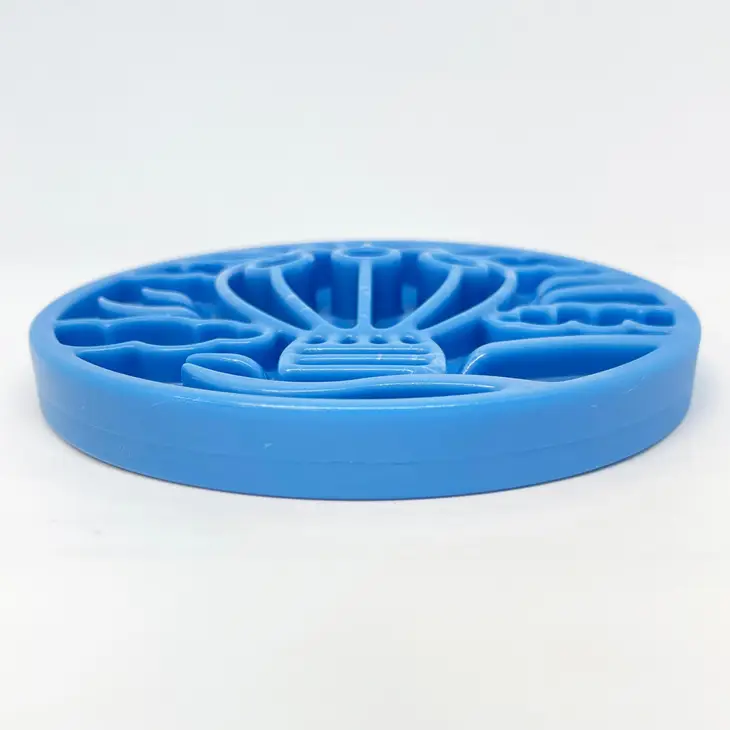 Alfombrilla extra dura con forma de moneda y un dibujo de globo, ideal para untar yogurt o comida húmeda y ofrecérsela a tu perro para que disfrute y se relaje lamiendp. tiene un agujerito en la parte superior para poderla colgar.