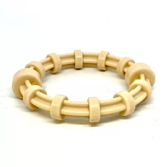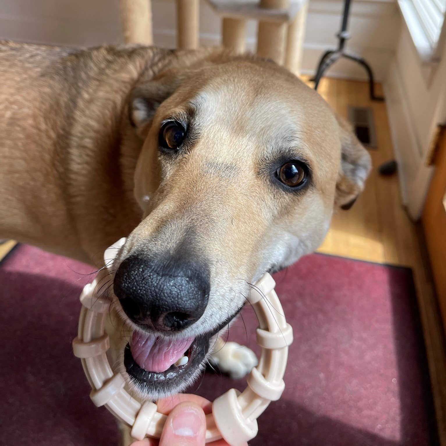 Está fabricado en Estados Unidos, es de nylon muy resistente y tiene sabor a pollo. Los mordedores reducen la ansiedad por separación y el aburrimiento.