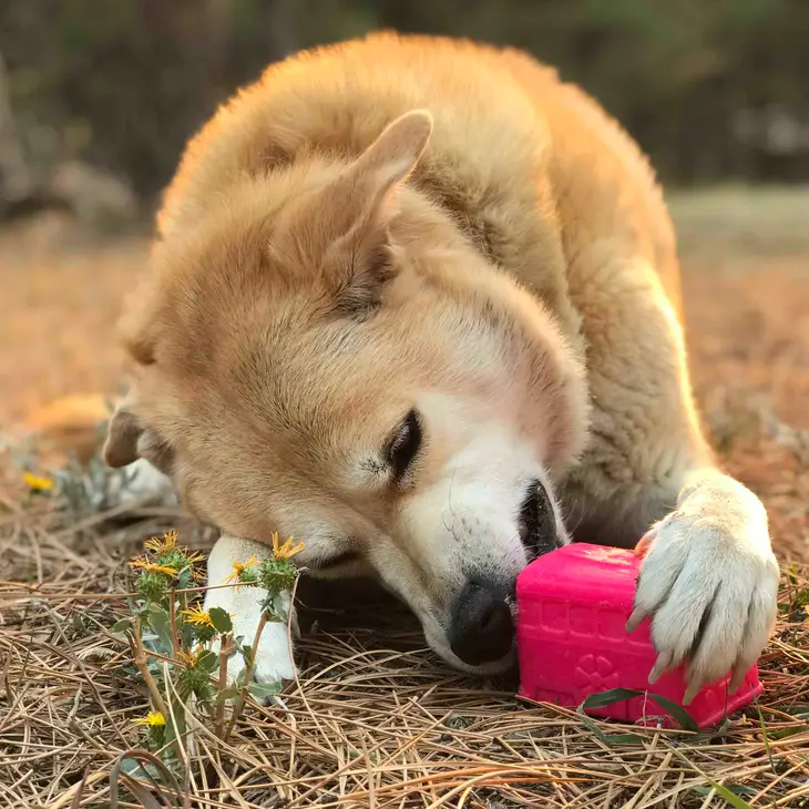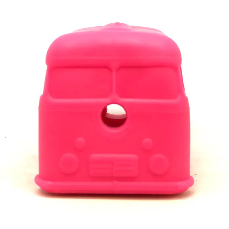 Juguete rellenable con forma de furgoneta hippie. con un espacio en su interior para introducir snacks, comida húmeda, barf, yogurt, etc. Las pestañitas que tiene en el agujero lo harán más complicado que cuando usamos otros juguetes rellenables.