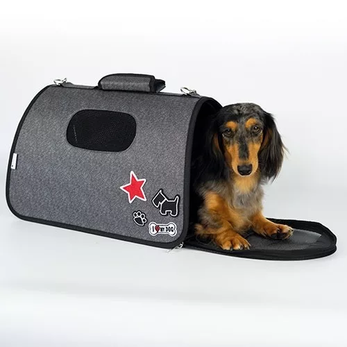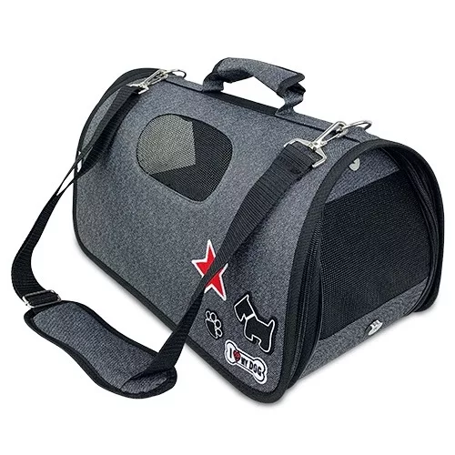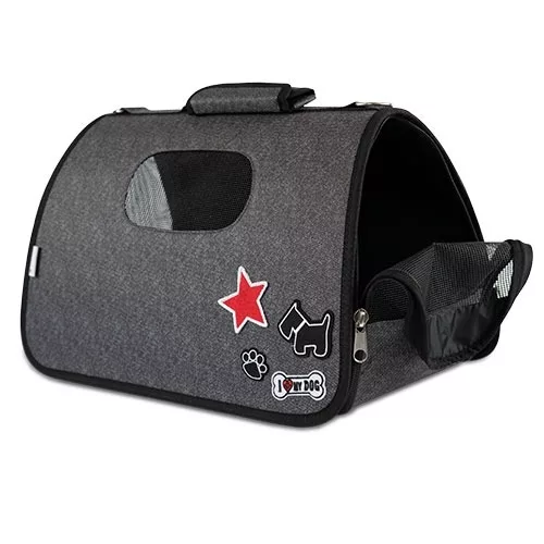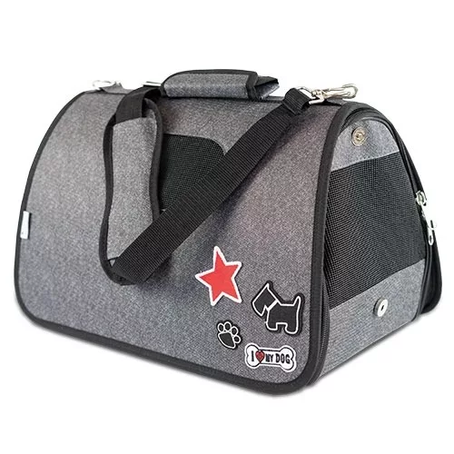 Práctico y elegante bolso para transportar su perro o gato de forma segura. Decorado con unos originales parches sobre fondo gris.