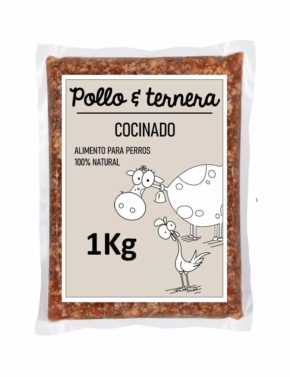 Ingredientes: 40% hueso carnoso de pollo, 40% magro de ternera, 10% de verduras (calabaza, judías verdes y zanahoria) 10% vísceras (5% higado de bovino, 5% bazo de bovino)
