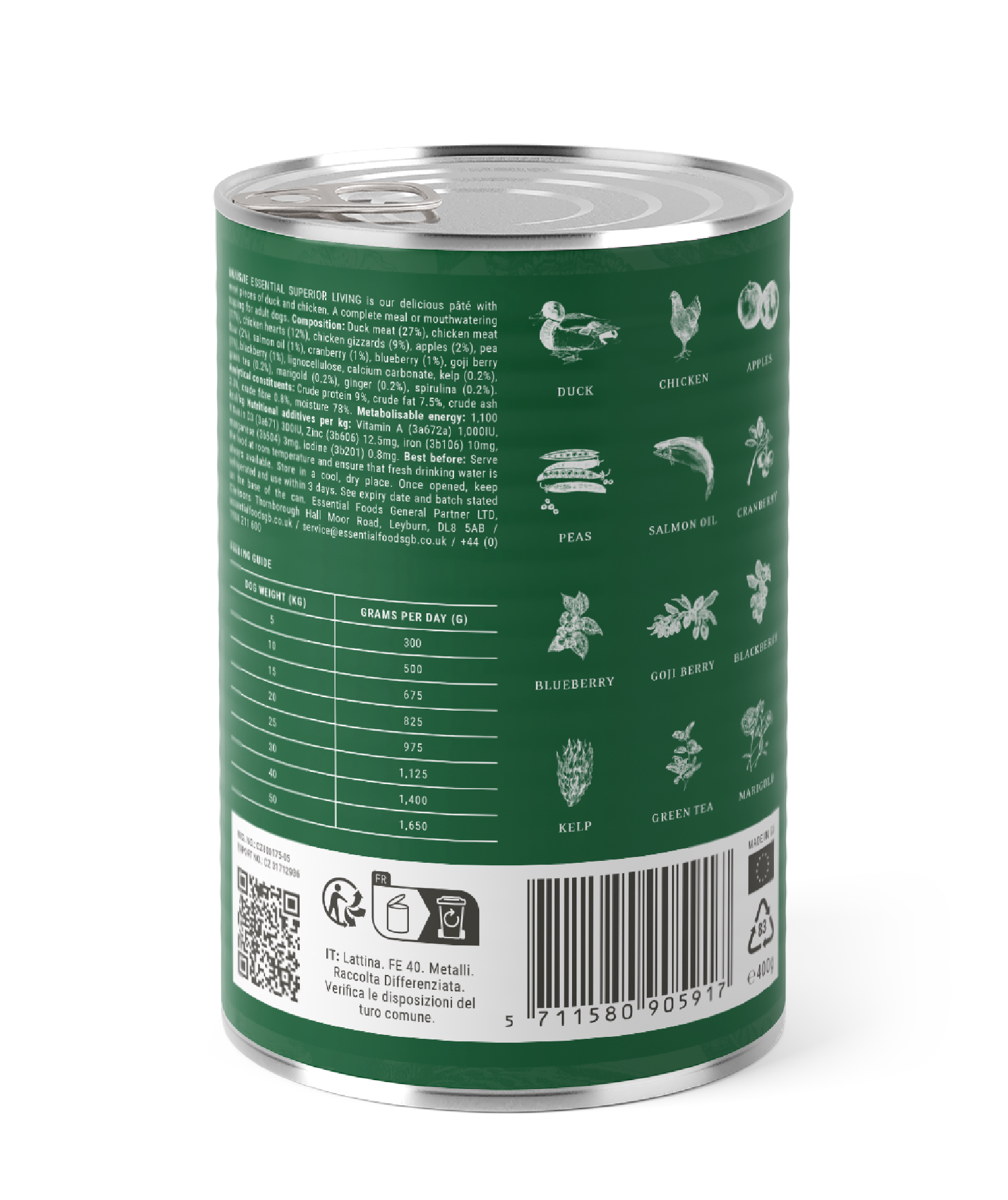 Carne de pato (27%), carne de pollo (17%), corazones de pollo (12%), mollejas