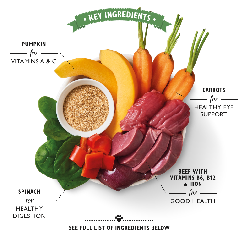 Ternera recién preparada (60%), calabaza (4%), zanahorias (2%) Espinacas (2%), Pimientos Rojos (2%), Amaranto, Espelta, Minerales, Aceite De Girasol (0,2%), Canela (0,1%), Perejil (0,1%). Hierbas y productos botánicos: vara de oro, ortiga, anís, rosa mosqueta, pétalos de caléndula, cuchillas, algas marinas, alfalfa, cardo mariano, raíz de diente de león, raíz de bardana, semillas de apio.