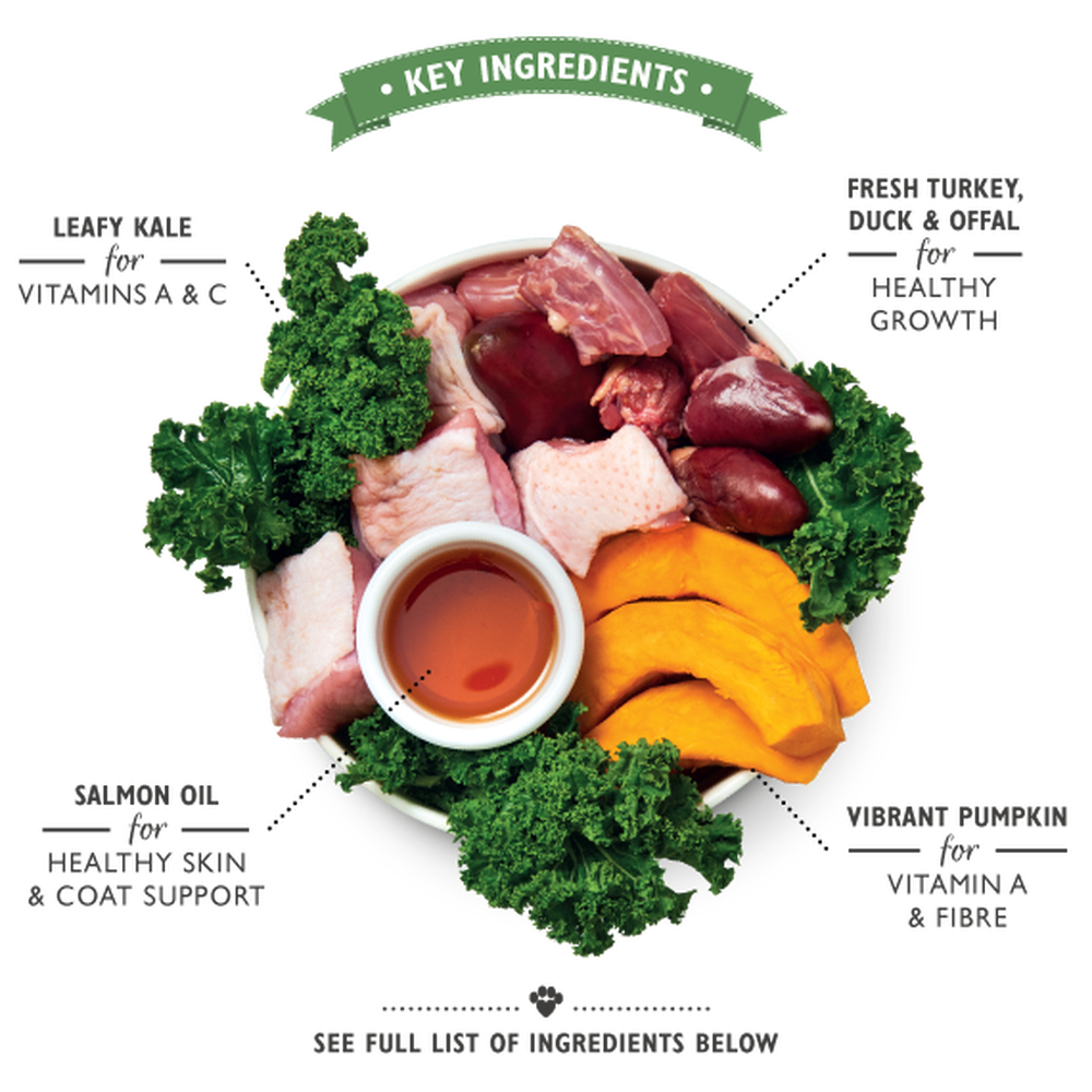 Pavo Recién Preparado (41%); pato (20%); Batatas (4%). Calabaza; col rizada (2%); arándanos rojos; Patatas; Zanahorias; vitaminas y minerales quelados; Aceite de Salmón (0,5%)