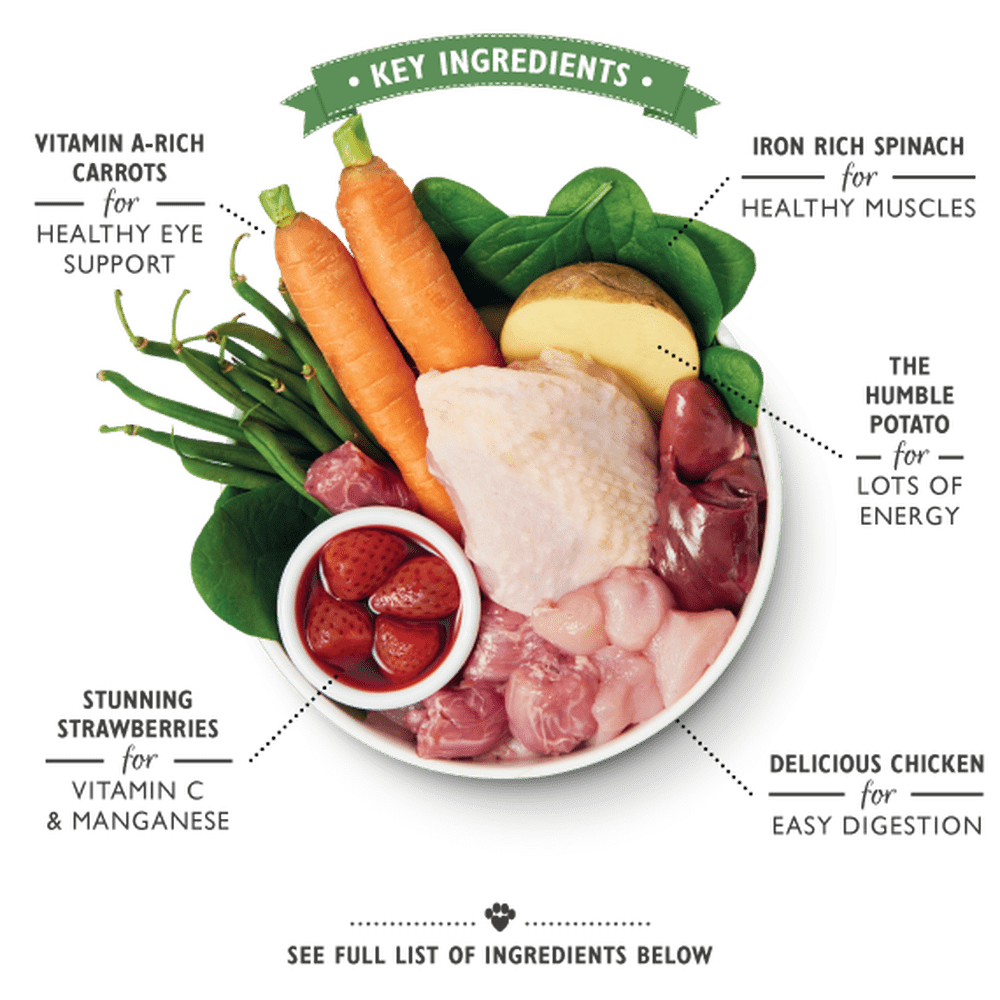 pollo (65%); Patatas (2%); Fresas (1%) Zanahorias, judías verdes, espinacas, aceite de cáñamo. Hierbas y productos botánicos: vara de oro, ortigas, anís, rosa mosqueta, pétalos de caléndula, cuchillas, algas marinas, alfalfa, cardo mariano, raíz de diente de león, raíz de bardana, semillas de apio.