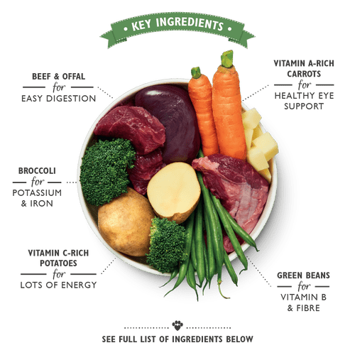 Carne de Res Fresca (60%); Patatas (3%); Zanahorias (3%)