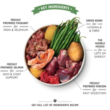 Ingredientes: Venado (40%); Faisán (15%); Salmón (10%), Patatas (3%), calabaza, judías verdes (1%), manzanas, vitaminas y minerales, aceite de cáñamo (fuente de Omega 3 y 6) Hierbas y productos botánicos: Vara de Oro, Ortiga, Anís, Semillas de Apio, Escaramujo, Pétalos de Caléndula, Menta, Algas, Alfalfa, Cardo Mariano, Raíz de Diente de León, Raíz de Bardana
