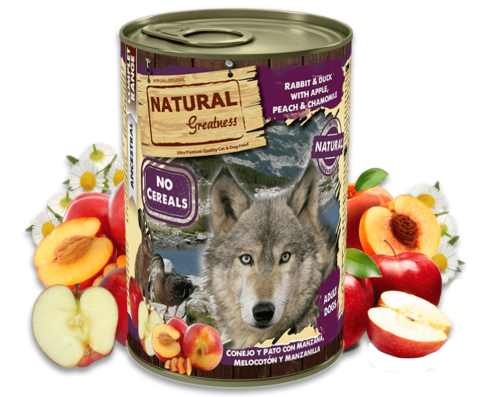 Conejo (min. 35%: que consta de carne magra, corazón, hígado y pulmones), pato (min. 31%: que consta de carne magra, corazón, hígado y pulmones), caldo de carne, manzana, melocotón, minerales, manzanilla y aceite de Salmón.