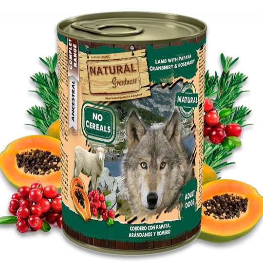Cordero (carne magra, corazón, hígado y pulmones) (min. 65%) , caldo de carne, papaya, arándanos, minerales, romero, aceite de salmón.
