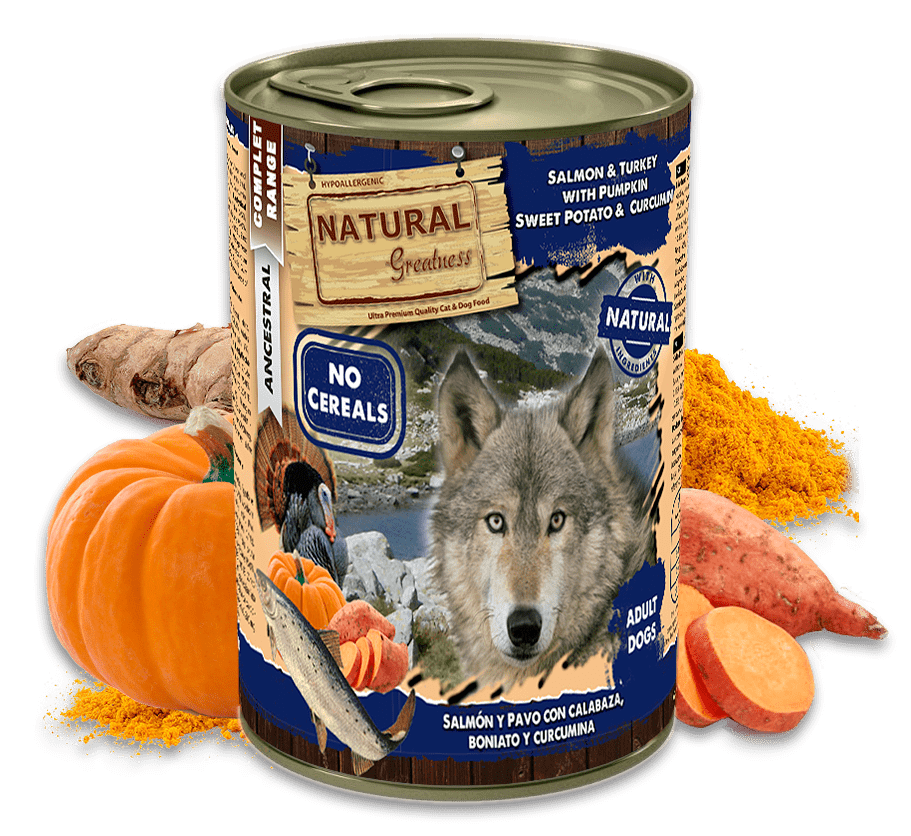 Composición: Pavo (carne, corazón, hígado y cuello) (50%), Caldo (28,8%), Salmón (15%), Calabaza (3%), Boniato (2%), Minerales (1%), Curcumina (0,1%), Aceite de Salmón (0,1%).