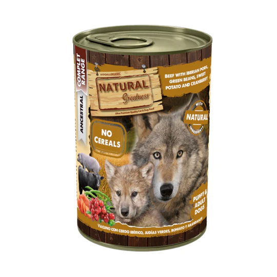 Vacuno (26 %), Cerdo (20 %, del cual 4 % de Corazón de cerdo ibérico), Aceite de salmón (2 %), Judías verdes (2 %), Boniato (4 % a partir de deshidratado), Sustancias minerales y Arándanos (2 % a partir de deshidratado).