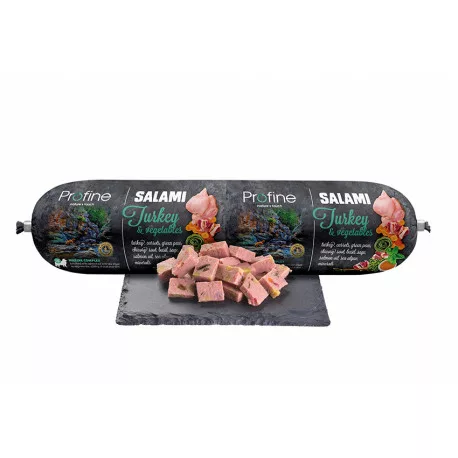 COMPOSICIÓN: 90% de carne de pavo y vísceras, 4% de verdura (zanahoria, guisantes verdes), 3% de complejo marino (aceite de salmón, algas marinas), caldo, minerales, 0,1% de hierbas secas (raíz de achicoria, albahaca, salvia).