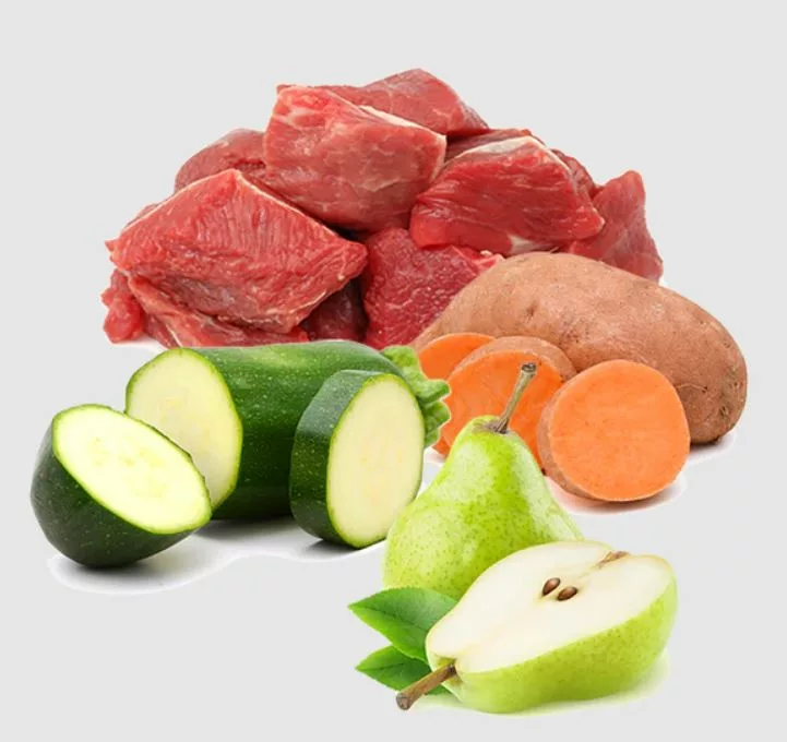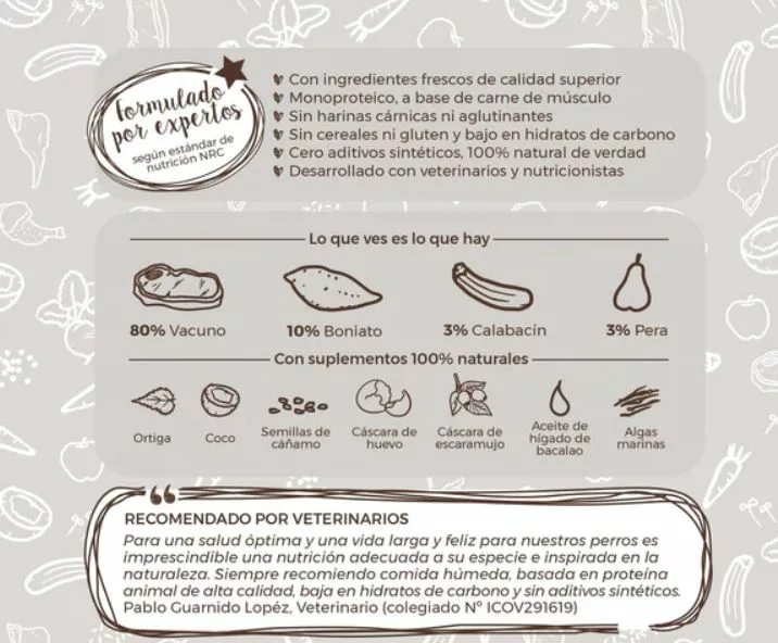Composición: Carne de músculo de vacuno (42%), corazón de vacuno (18%), caldo de vacuno (10,5%), boniato (10%), hígado de vacuno (7%), pulmón de vacuno (4%), calabacín (3%), pera (3%), ortiga, coco, semillas de cáñamo, polvo de cáscara de huevo, cáscara de escaramujo, aceite de hígado de bacalao, ascophyllum nodosum (algas marinas).